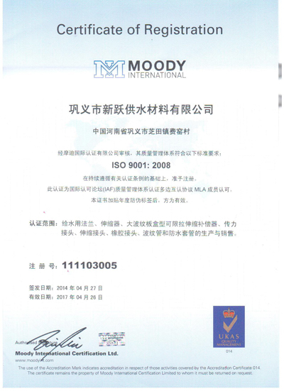 歡迎來到鞏義市新躍供水材料有限公司官方網(wǎng)站!您現(xiàn)在訪問的是:《ISO9001中文認證》頁面,如需幫助請致電:13140066578 或 0371-64100988